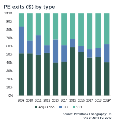 The go-public exit route clocked its highest quarterly value in five years in the US, bringing in a total of $21.8 billion in 2Q, according to PitchBook's 2Q US PE Breakdown. Through the first half of 2019, IPOs accounted for a larger share of overall exit value than any year since 2013. These days, they are as pricey as they are plentiful.