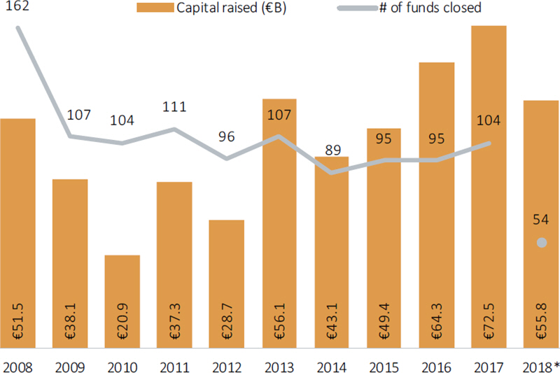 This year has seen a healthy level of fundraising so far, despite a slow third quarter, with PE firms collecting €55.8 billion for 54 vehicles overall in the first nine months of 2018. It is important to note that the vast majority of this capital originated from 1Q fund closes, with the two following quarters seeing a dramatic decrease in activity. However, 2018 is set to be on par with last year's record-setting total in terms of capital commitments. Whether the last two quarters suggest the end of the party, however, remains to be seen.