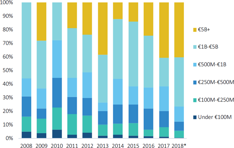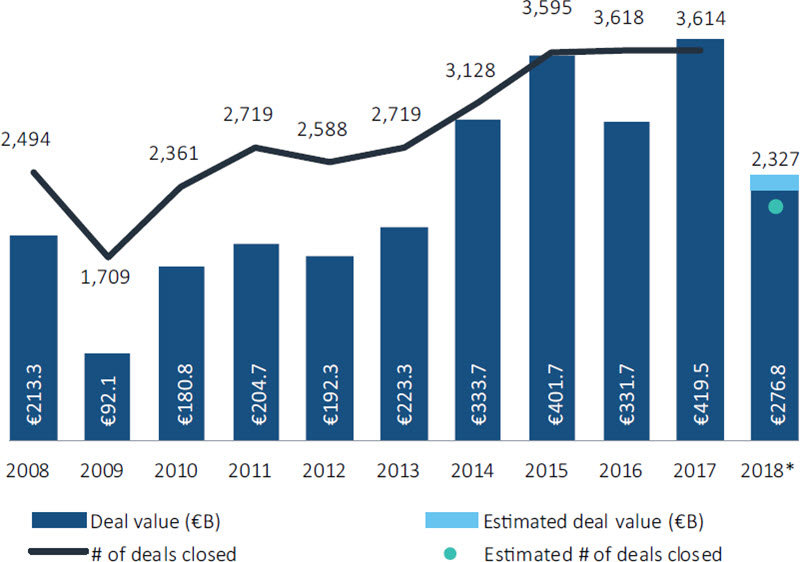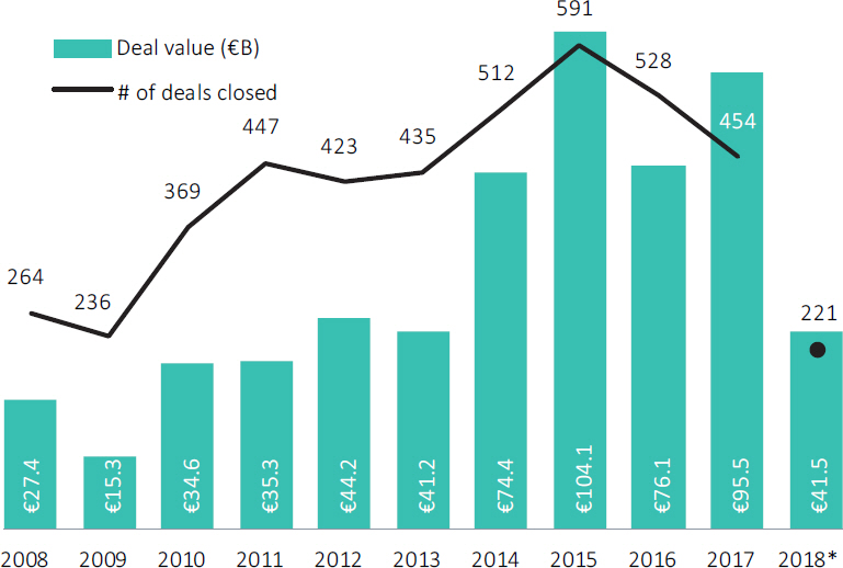 The third quarter saw some 731 transactions take place with a combined value of €82.6 billion, bringing the totals for the first nine months to 2,327 deals worth €276.8 billion—a 14.8% and 15.3% decrease, respectively, compared with the first three quarters of 2017. A lack of deals worth more than €2.5 billion could account for the drop in value; only eight have been completed thus far, compared with 14 during the same period in 2017.