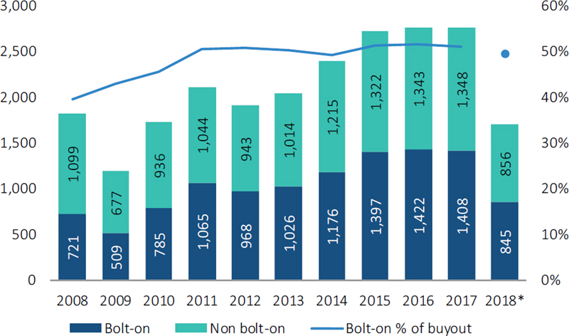 The proportion of bolt-on transactions has remained at a consistent level, accounting for around half of all PE buyouts—equating to 845 completed deals in 2018. While the percentage of bolt-ons has lingered around the 50% mark since 2011, this type of transaction may become more prevalent as GPs find that funds with platform companies that see higher levels of bolt-on activity have been associated with better performance.