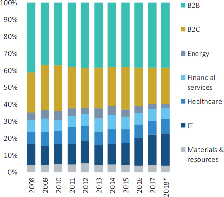 For the fifth consecutive year, deals within the IT sector have been taking up an increasing share of total PE transactions. B2B is still the preeminent sector, with the proportion of deals in this area remaining stable at about a third of overall activity since 2012. Meanwhile, investments in both healthcare and financial services have seen a slight decrease as a proportion of overall deals.