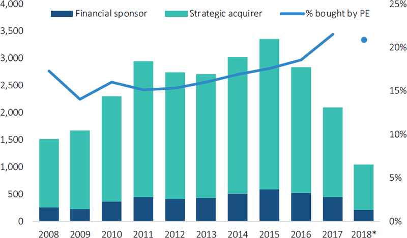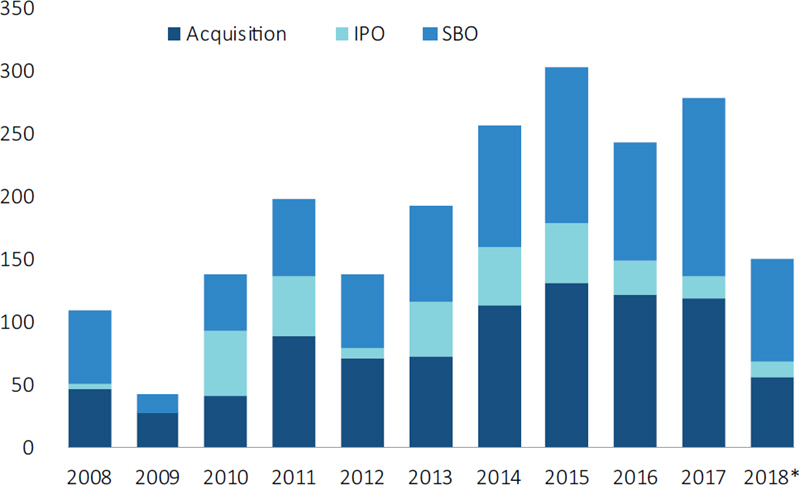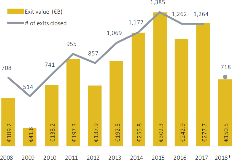 GPs have exited just 718 companies for a combined €150.5 billion so far this year, putting 2018 on pace to fall far behind last year's 1,264 exits worth €277.7 billion. This may be explained by the fact that sizable exits have been a rarity, as deal values in the €2.5 billion-plus bracket dropped to their lowest levels since 2009.